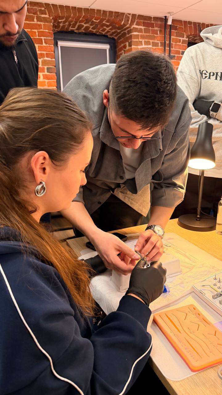 Курс включал в себя насыщенную теорию и практику с отработкой навыков установки имплантатов на моделях и соблюдением параллельности. Будущие стоматологи также научились выполнять забор мягкотканого трансплантата, фиксацию к лоскуту и наложение швов.